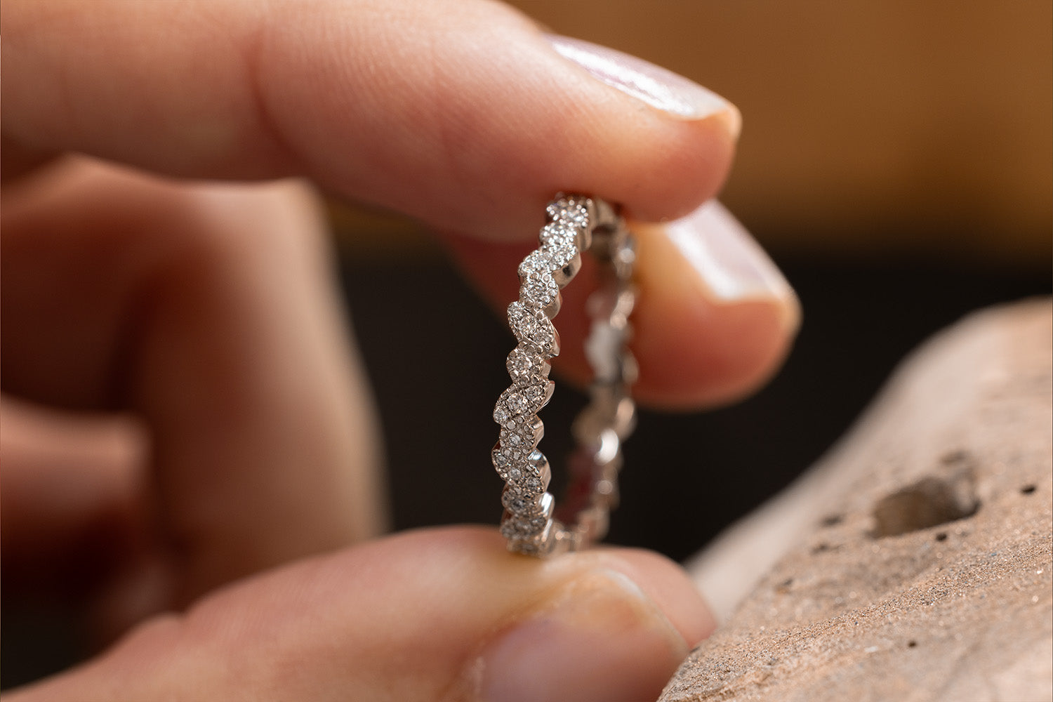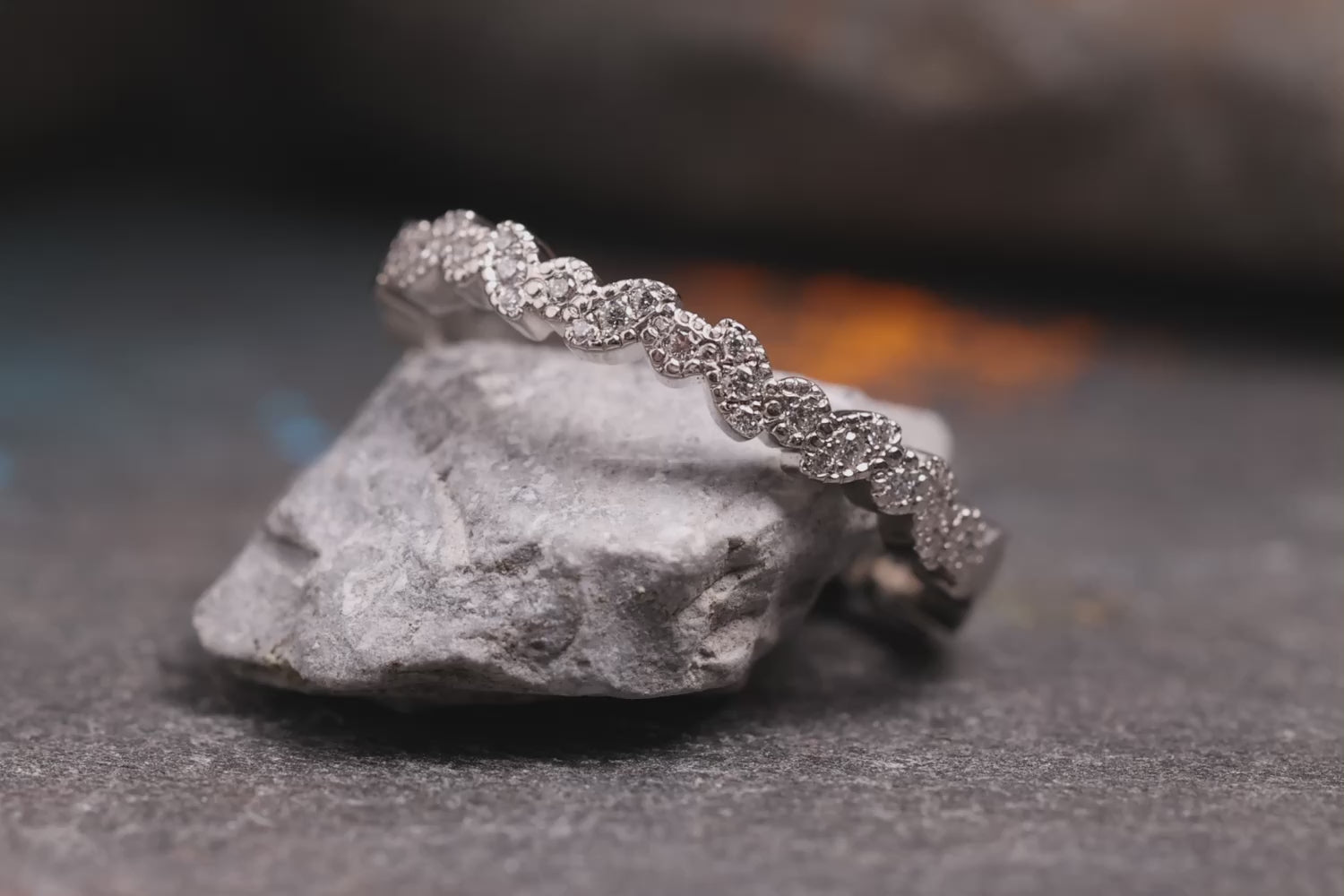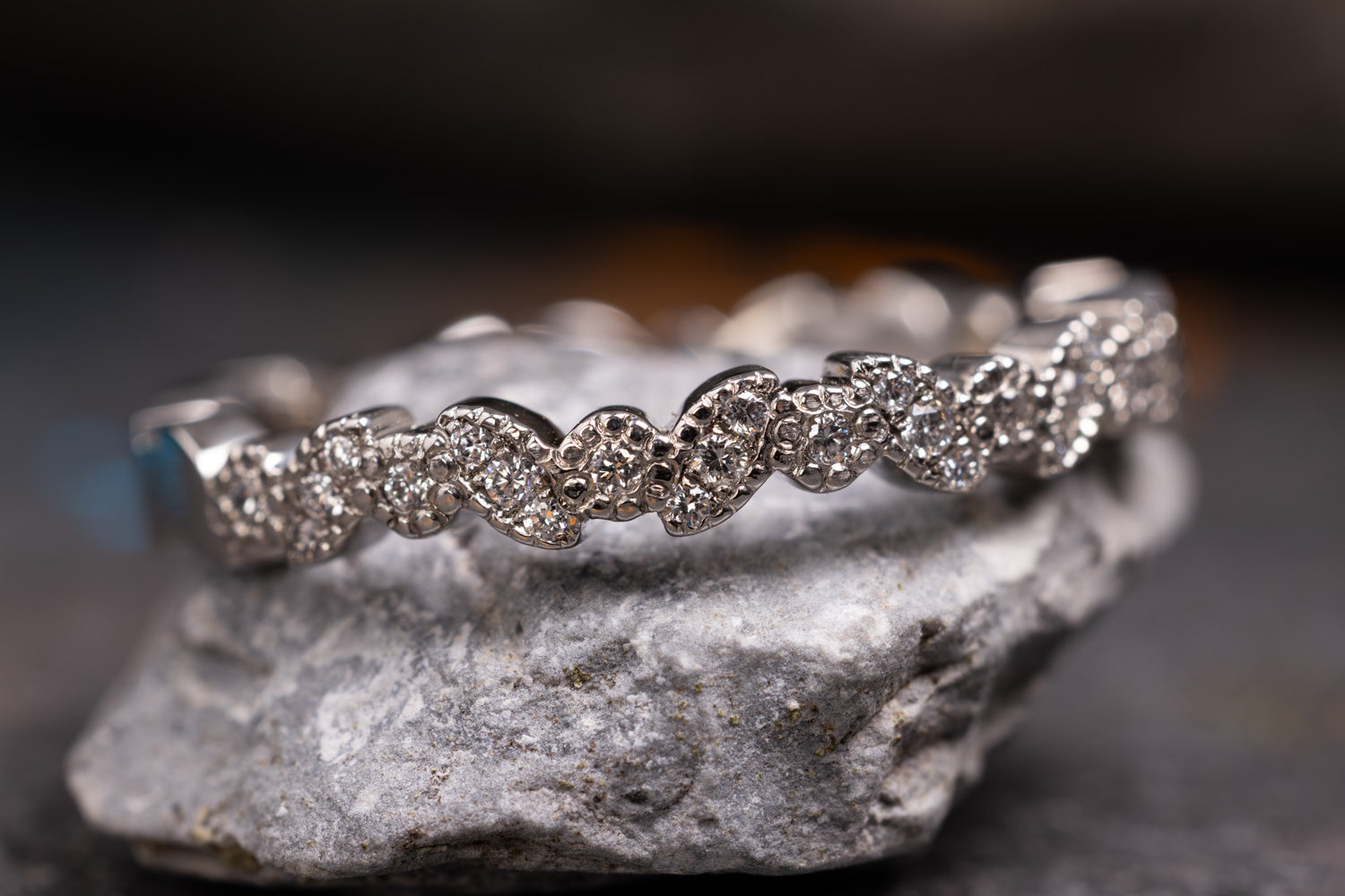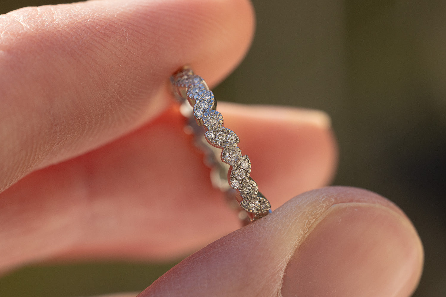 In dem Verlobungsring sind 25 verschieden große Diamanten gefasst. Die Steine gehen je nach Ringweite etwa um den halben Ring.
