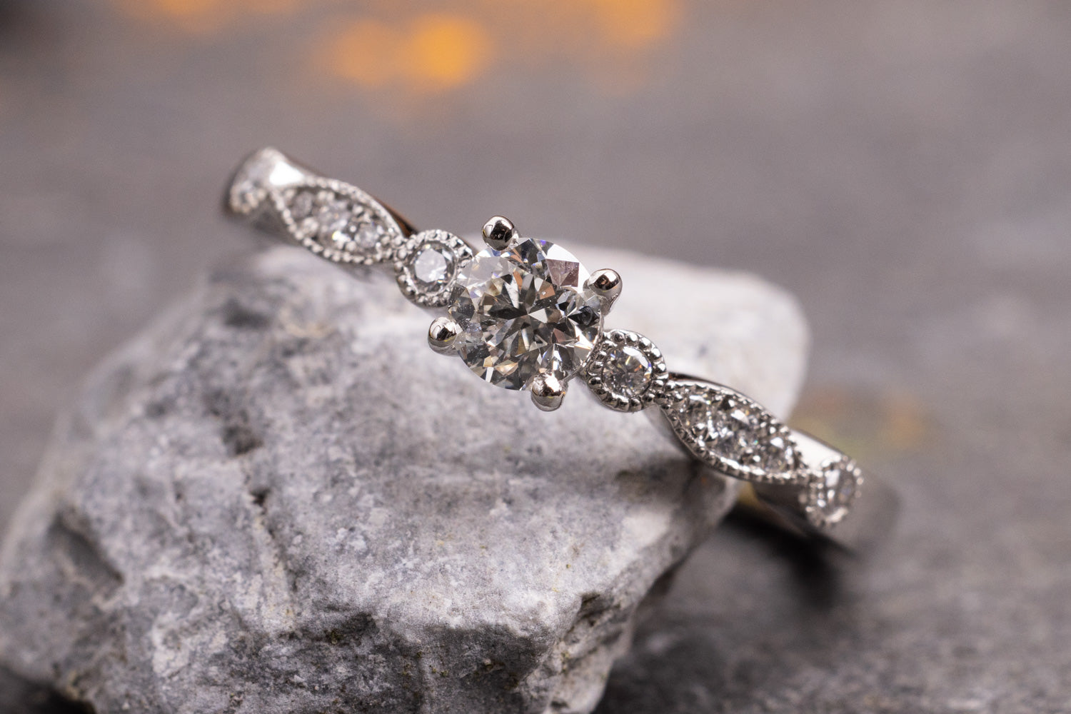 In dem Verlobungsring Lilly ist ein Mittelstein mit 0,22ct gefasst und von 10 kleinen Diamanten in der Ringschiene eingerahmt.