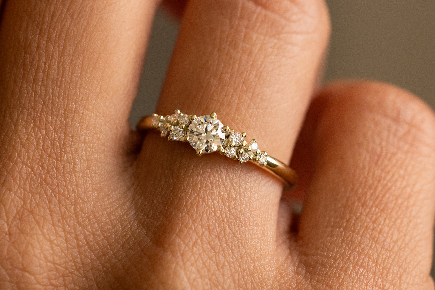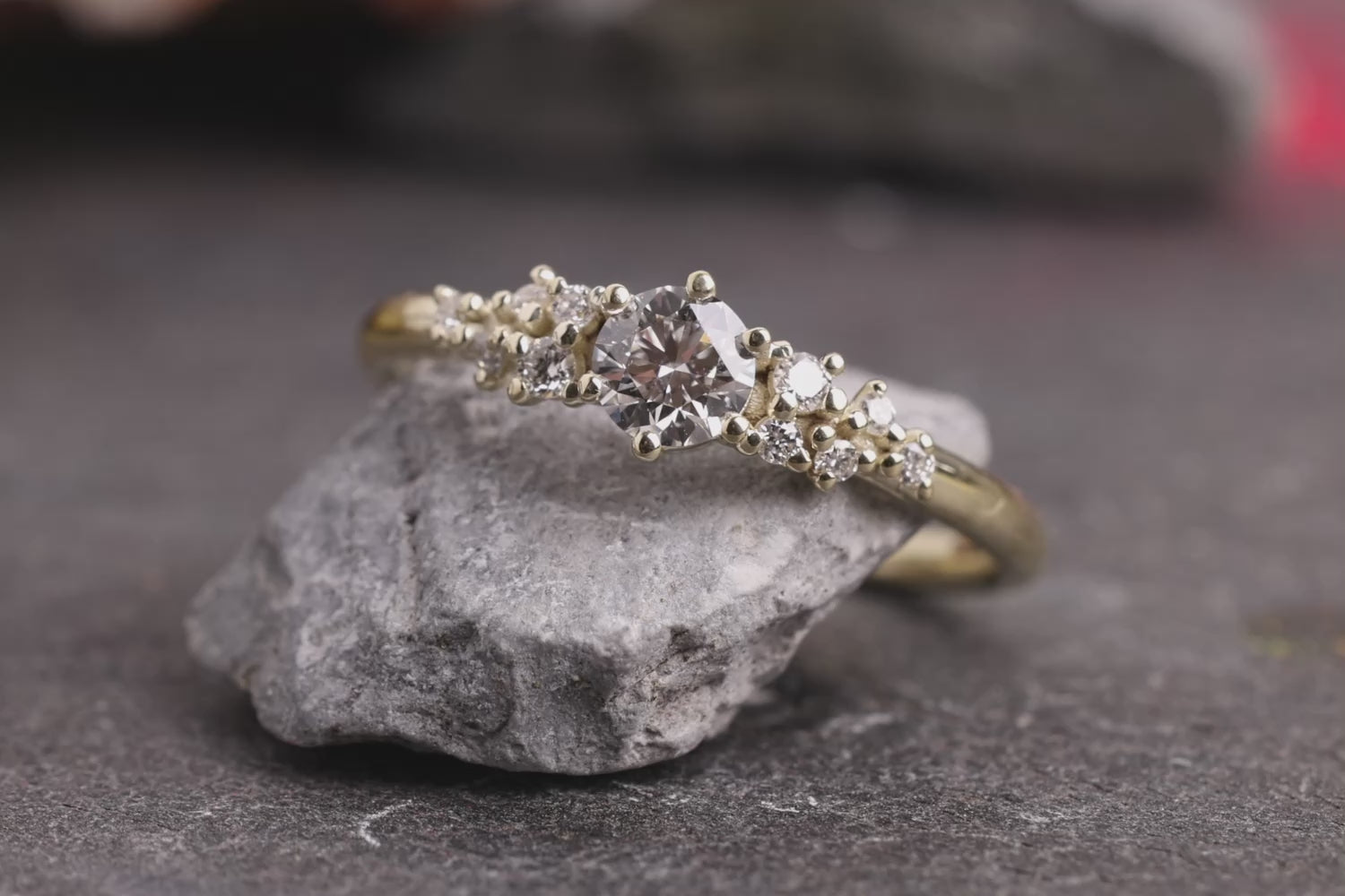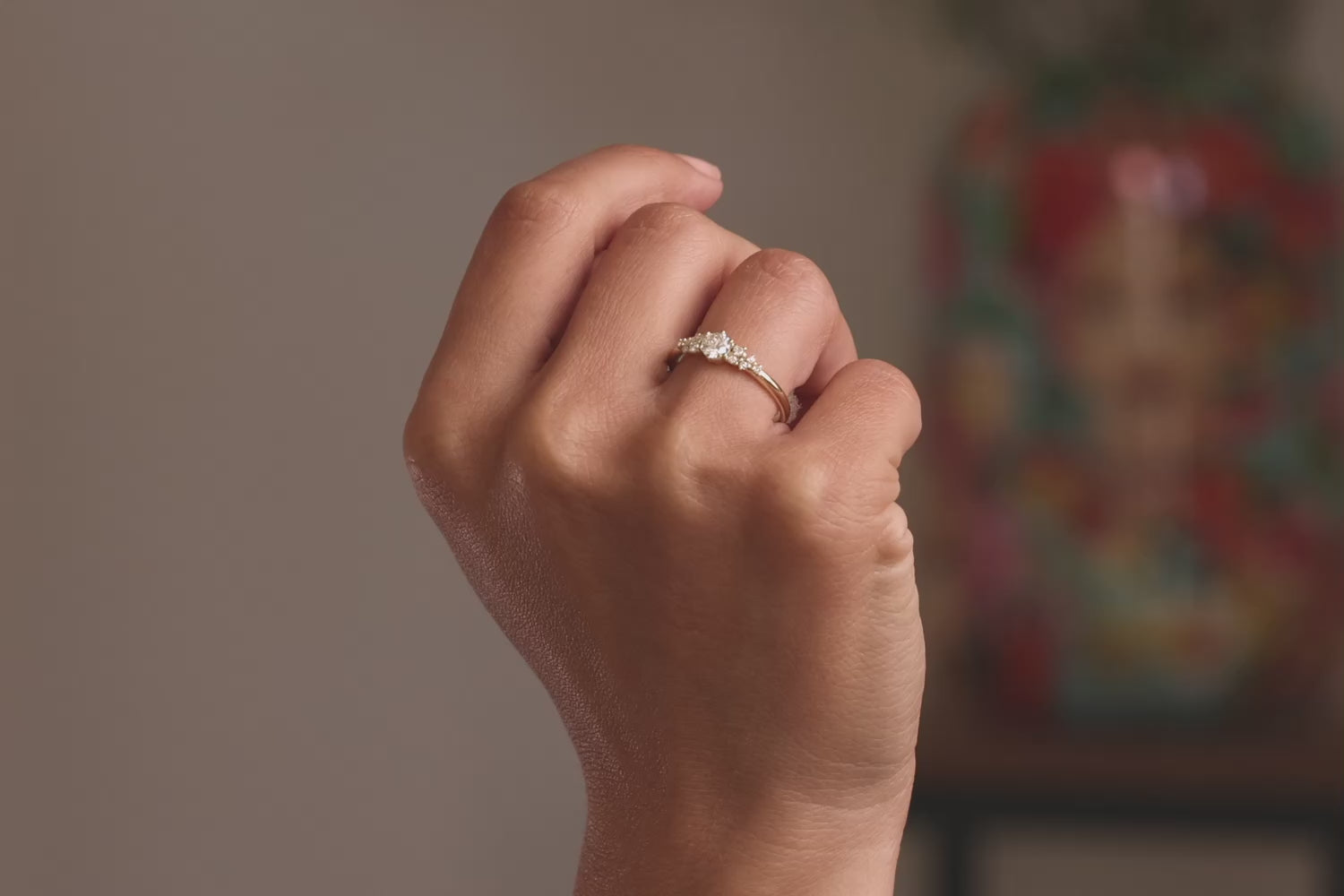 Der Mittelstein ist ein 0,3 ct großer „Lab Diamond“ - also ein Diamant aus dem Labor. Er funkelt genauso wundervoll wie ein natürlicher Stein. Umgeben ist der Mittelstein von 10 kleinen Diamanten.